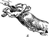 Рукой, продвинутой до дистального конца конечности, захватывают путовую область или лучше непосредственно копытце и, сильно согнув все суставы конечности, осторожно направляют ко-