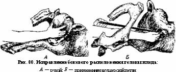 Скручивание шеи плода. При вклинившейся в таз голове в нижней позиции плода (нижняя челюсть направлена кверху) скручивание шеи наблюдается главным образом после неудачного выправления завернутой в сторону головы, реже как самопроизвольное явление у мертвых плодов. Если плод мертвый, предпочтительна фетотомия в виде удаления части головы или краниальной части конечности (для освобождения места). Для придания правильного положения голове плода пытаются повернуть ее вокруг своей оси, иногда достигают цели поворотами матери при фиксации головы плода (по принципу раскручивания матки).