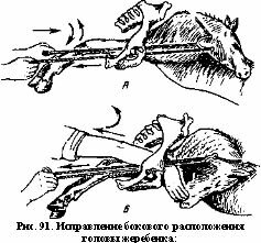 Небольших жеребят можно попытаться (как крайняя мера) извлечь без предварительного исправления положения головы в расчете на то, что она, смещаясь вследствие длинной шеи кзади, расположится в области голодной ямки плода и будет в нее вдавлена при прохождении через широкую тазовую полость кобылы. При нижнем завороте и закидывании головы плода техника ее выправления у кобыл значительно труднее, чем у коров. Для этого приходится, использовать петли и крючки по уже описанному принципу.