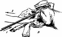 пытце в тазовую полость. Эта операция удается только после предварительного отталкивания плода в полость матки и если одновременно с подтягиванием ножки прилагается значительная сила для отталкивания крупа плода посредством клюки с упором ее в седалищную вырезку. Для предотвращения соскальзывания одну из развилок костыля вводят непосредственно в анальное отверстие плода. Иногда удобнее подтягивать конечность веревкой (рис. 95).