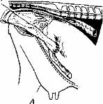 Заворот головы у плодов мелких животных. При заворотах головы у ягнят и козлят поступают так же, как и у плодов коров. Если рука не проходит через родовые пути, пытаются зацепить голову плода крючком за глазницу или щеку; лицевую часть головы подтягивают к входу в таз и одновременно отталкивают плод за выступающие конечности.