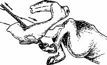 Рис. 98. Исправление конечности жеребенка при бедренном предлежании клюкой Кюна