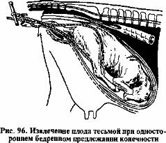 бедренных суставах, плод извлекают бечевкой, обведенной вокруг конечностей, или с помощью двух крючков, зацепленных за коленные складки. Хороший эффект получается иногда при применении крючка через анальное отверстие плода.