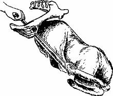 Рукой, продвинутой до дистального конца конечности, захватывают путовую область или лучше непосредственно копытце и, сильно согнув все суставы конечности, осторожно направляют ко