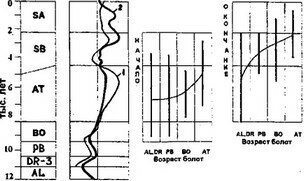 На рубеже послеледникового и позднеледникового времени — 10300-10500 лет назад на Локотенском болоте формируются евтрофные торфа древесно-травяной группы (рис. 2). В РВ-2 уменьшилась облесенность центра Русской равнины. Формируются низинные осоково-гипновые торфа. В начале бореального периода Локотен- ское болото переходит в стадию мезотрофного болота, а в середине бореального периода болото перешло в олиготрофную стадию. Во второй половине этого периода в растительном покрове болота господствовали фускум- сообщества.В начале атлантического периода торфяник представлял собой фускум- залежь. заключительным этапом развития которой часто является денудационный комплекс. С середины АТ большую роль в растительном покрове начинает играть сосна и пушица. Слой торфа, отложившийся в АТ-2, по своим свойствам напоминает пограничный горизонт. Для суббореального периода характерно появление Sphagnum magellanicum и S. angustifolium и уменьшение роли сосны и пушицы. Субатлантический период характеризуется увеличением роли S. magellanicum и S. angustifolium при почти полном отсутствии сосны. На примере Локотенского болота видно, что для развития болот большее значение имеют эндогенные факторы.