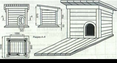 (боксер, ротвейлер) соответственно 1,15 х х 0,75 х 0,8 м, размер лаза 0,35 х 0,5 м; для крупных собак (дог, кавказская овчарка) — 1,35 х 1,0 х 0,95 м, размер лаза
