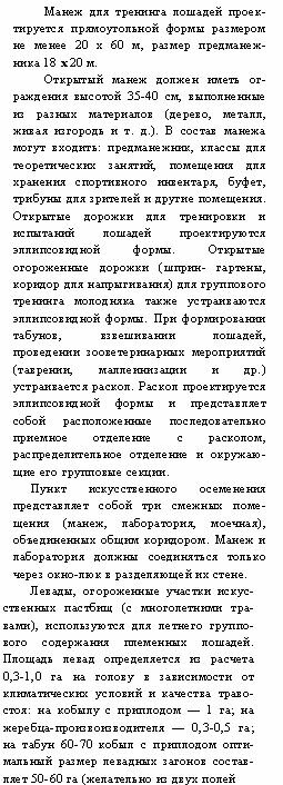 Индивидуальные паддоки предусматривают на 10-15% жеребцов-производи- телей и молодняка в тренинге, размещенных в денниках, групповые —- на 15-20% поголовья лошадей, размещенных в секциях. Вместимость групповых паддоков определяется размерами обслуживаемых секций.