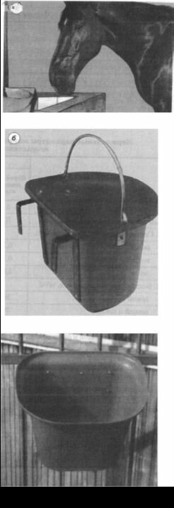 Индивидуальные автопоилки (клапанные) устанавливают по одной на денник или на стойло. Групповые водопойные корыта фронтом 0,6 м на одно водопойное место или на четыре лошади предусмотрены следующего размера: по верху 0,6 м, по низу 0,4 м, и глубиной 0,4 м. Высота установки от пола до верха: индивидуальных поилок 0,9-1 м и групповых 0,5-0,7 м. Кроме того, нередко лошадей поят из индивидуальных ведер,