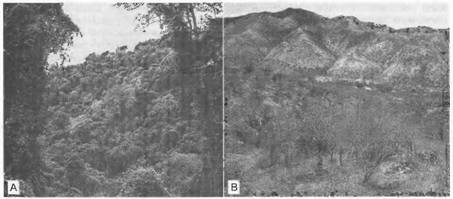 13.3. Региональные климатические последствия сведения лесов.Между левым и правым изображениями лежит примерно 400 летняя история. Первооткрыватели 16-го столетия описывали эти места как зеленые джунгли (А- близ Валенсии); в наше время в этой части Венесуэлы в результате сведения лесов, перевыпаса скота, деградации почв и повторяющихся пожаров господствуют колючие кустарники (В — близ Баркисимето). Прогрессирующая ликвидация транспира- ционного охлаждения (см. рис. 13.2) привела к региональному потеплению и семиаридному климату. Отношение Боуэна ((3), равное примерно 1, держит экосистему слева сравнительно прохладной (lt; 30 "С), а равное значительно больше 1, допускает повышение температуры в системе справа свыше 40 "С, что само по себе вызывает сильный восходящий поток тепла и приводит к снижению осадков