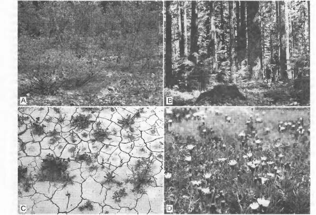 14.12. На разных фазах сукцессионного процесса доминируют растения, относящиеся к разным жизненным и репродукционным стратегиям. Древесные растения: А — молодые заросли распространяемых ветром ив и тополей на щебнистой отмели, В — 300-летний коренной хвойный лес (Pseudotsuga menziesii = дугласия, Орегон). Травянистые растения. С — рудеральное сообщество на намывной поверхности; D — зрелое климаксовое горно-луговое сообщество тысячелетнего возраста (Caricetum curvulae, 2 500 м, Западные Альпы). На А и С изображены виды с быстрым размножением и высокой семенной продукцией, на В и D — растения с медленным вегетативным ростом, на D — растения с клоновым расселениемшествовать в условиях светового дефицита до тех пор, пока молодое растение не начнет фотосинтезировать. Максимальный период покоя семян у таких видов редко длится более 2 лет. Как правило, семена этих видов всходят после короткого периода покоя в следующем сезоне, благоприятном для прорастания (в умеренной зоне следующей весной или самое позднее через одну весну). Вместо семенного банка у К-стратегов часто образуется банк проростков, которые могут долго выжидать, пока наличие свободного пространства не обеспечит им возможность дальнейшего развития (это типично для девственных влажнотропических лесов).