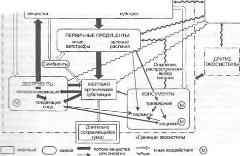 Под экосистемой понимается совокупность взаимодействующих абиотических и биотических компонентов в какой-либо ограниченной области. Абиотическая матрица (местообитание) обозначается как биотоп, а живая составляющая — как биоценоз.