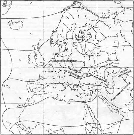 Рис. 14.19. Флористические области западной части Евразии и Северной Африки в пределах Голарктического флористического царства Северного полушария (по H.Meusel et al.):