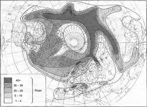 Рис. 14.20. Распространение 50 циркумполярно-арктоальпийских скандинавских видов в Северном полушарии. Концентрация соответственно снижается к краям, а обеднение этого геоэлемента показано штриховкой различной плотности (по Е. Hulten)