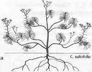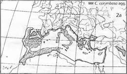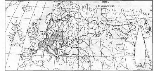Канарские и соответственно восточно-средиземноморские таксоны подрода Carlowizia и под- рода Lyrolepis (1а, Ь, слева внизу) — реликтовые и относительно более древние (исходные), другие (2а, b и За, Ь, с) — циркумсредиземноморс- кие и соответственно средиземноморско/мон- танно-центрально-европейские, расширяющие ареал и прогрессивно производные. Аллопатри- ческая дифференциация С. vulgaris на западе и С. biebersteinii (лист изображен сверху справа) на востоке. (Ареалы даны по Е. Jager et al.; жизненные формы — по G. Morchen и A. Kostner)
