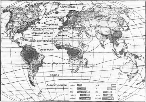 14.22. Флористические зоны и секторы океаничности биосферы Земли (сокращения см. в тексте) (по E.Jager)лы находятся в удаленных от побережья районах с сухим климатом и большими температурными амплитудами.