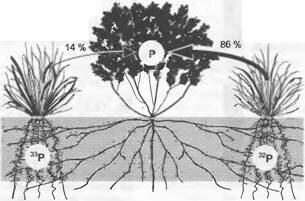 Гетерогенность, связанную с конкуренцией, можно продемонстрировать на примере потребления фосфора. К сожалению, фосфор не имеет стабильных изотопов, однако можно использовать радиоактивный изотоп, с помощью которого при высокой степени разведения можно проследить пути фосфора от определенных источников Р в почве к растениям. Водном классическом эксперименте (рис. 13.26) М. Колдуэлл с сотрудниками выясняли, откуда доминантный в Большом Бассейне (США) кустарничек Artemisia tridentata получает фосфор, когда он делит почвенное пространство с двумя видами злаков рода Agropyron. Agropyron desertorum — агрессивный неофит, угрожающий вытеснить A. tridentata, а A. spicatum — аборигенный вид, издавна свойственный флоре Большого Бассейна. Маркированные 32р и ззр фосфорные удобрения были введены в корневое пространство обоих видов Agropyron, и спустя некоторое время определено соотношение обоих изотопов у Artemisia. Результат: Artemisia имеет мало шансов на то, чтобы приблизиться к фосфору в сфере влияния A. desertorum, фосфор в тканях A. tridentata происходит почти целиком из корневого пространства A. spicatum. Неофит в этом жизненном пространстве — «расхититель» фосфора.
