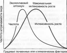 Рис. 12.1. Естественное произрастание и максимальная интенсивность роста изолированных индивидуумов одного вида растения вдоль градиентов внешней среды.