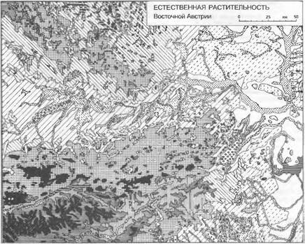 Рис. 14.43. Деление растительного покрова Центральной Европы на примере Нижней Австрии. Потенциальная естественная климаксовая растительность (почти повсюду леса!), соответствующие ей высотные пояса и большие пространства длительно производных растительных сообществ (по Н.Wagner и H.EIIenberg).