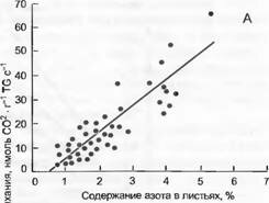 Рис. 13.23. Митохондриальное дыхание и концентрация азота в листьях (по Р. Reich et al.):