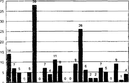 Рис. 6.4. Возрастная структура популяции сосны на старой вырубке (цифры обозначают среднее число особей на пробной площадке)