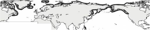 Ареал аркто-тихоокеанских видов охватывает бореальные районы Тихого океана и Северный Ледовитый океан, т. е. он относится к аркто-бореальной группе ареалов. В Атлантическом океане, они, если и встречаются, обитают только в охлаждённых водах у Северной Америки, населённых арктической шельфовой ЦС (Несис, 1962а, б, 1968). Примером этого типа ареалов являются ареалы Serripes groenlandicus и Ciliatocardium (в атлан- то-арктической части ареала род представлен одним видом С. cdiatum) (рис. 6.23) (Скар- лато, 1981; Кафанов, 1982; Кафанов, Кудряшов, 2000: 145). Некоторые виды распространены в Тихом океане ещё шире (см. ареал Nothria hyperborea на рис. 5.1 и 5.9).