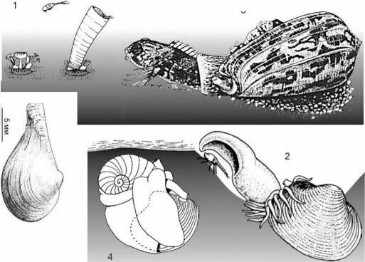 1,2 — двустворчатые моллюски: 1 — Cuspiclaria: вверху стадии поимки копеподы сифоном, внизу — общий вид; 2 — Poromya granulata, ловящая кумового рака похожим на капюшон вводным сифоном; 3 — брюхоногие моллюски: 3 — Conus, поймавший рыбу; 4 — Naticidae, сверлящая дырку в раковине двустворчатого моллюска. По разным авторам.