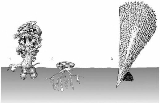 течений, особенно характерны для больших глубин. Для того, чтобы закрепиться в мягком грунте и поднять свой фильтрующий аппарат над ним, многие развивают корнеподобные образования и более или менее длинный стебель, на котором расположен фильтрационный аппарат по типу ловчих сетей. Эти две особенности морфологии, определяемые сходной биологией, определяют и их внешнее конвергентное сходство.