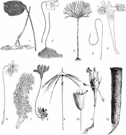 1,2 — асцидии; 3 — Bryozoa; 4-7 — Peimatularia (4 — Kophobelemnotr, 5 — Virgularicr, 6 — Umbelullcr, 7 — Veretillum)', 8 — стебельчатая морская лилия Rhizocrinus Iofotensis\ 9-12 — губки. По разным авторам.