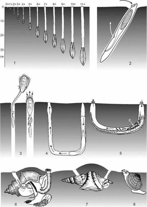 1 — двустворчатый моллюск Муа разных возрастов; 2 — ланцетник Branchiostorna lanceolaturn:; 3 — брахиопода Lingula; 4— эхиурида Urechis сайро; 5 — полихета Chaetopterus (с — ловчая сеть); 6,7 — брюхоногие моллюски Strutiolaria papillosa (Trochidae) и Aporrhais pespelekani, пеликанья нога; 8 — двустворчатый моллюск Cardiidae. Стрелки — направление тока воды. По разным авторам.