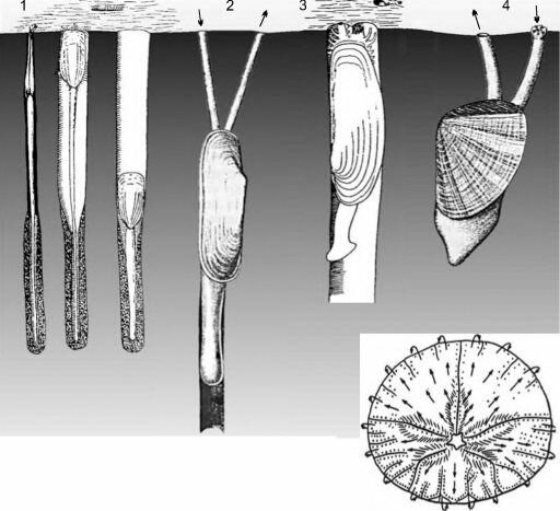 - — Tagelus plebius; 3 — Solen pellucidus; 4 — Donax cariabilis. Стрелки — направление тока воды. По Hesse (1924) и Рупперт и др. (2008).