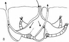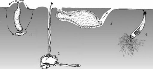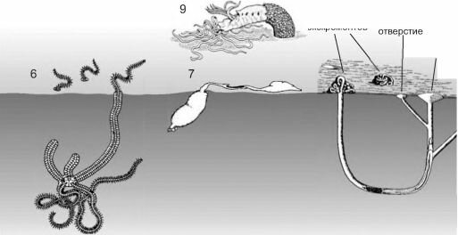ежи Echinocardium (2) и Echinosigra phiale (3); 5,6 — полихеты: Clymenella torquata (5) и Pectinaria koreni; 4,1 — моллюски: Scaphopoda Cadulus tolmieri (4) и Caudofoveata (7); 8 — морская звезда отряда Phanerozonia. Стрелки — направление движения воды. По разным авторам.