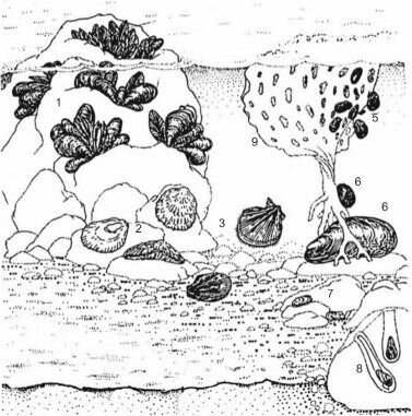 В местах с активной гидродинамикой, где процессы переноса осадков доминируют над процессами их накопления, современные осадки отсутствуют, дно здесь обычно покрывает субстрат, который вода размыть не может (валуны, скалы). На нём развиваются сообщества, в которых доминируют фильтраторы эпифауны (рис.