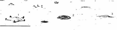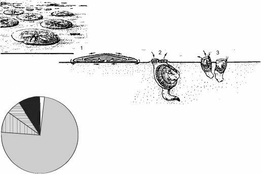 Рис. 3.12. Сообщество с доминированием фильтраторов инфауны. 1 — морские ежи Echinarachnius par та; 2 —двустворчатые моллюски Cili- atocarclium ciliaturn; 3 —бокоплавы Ampeliscidae. По А.И. Савилову (1961).