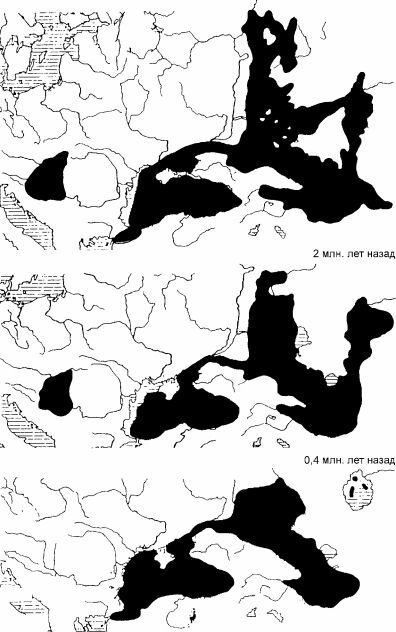 Поскольку восточная часть Паратетиса — один из основных нефтегазоносных районов СССР, его истории посвящено огромное число работ, и последовательность событий известна в деталях. В целом эта история — череда распадов востока Паратетиса на водоёмы в разной степени изолированные (рис. 6.18) и их объединения. В общем изоляция приводила к снижению солёности, порой существенному, тогда как установление связи с Тетисом или Средиземным морем — к увеличению солёности до близкой к нормальной океанической. Биота современного Чёрного моря, за исключением эстуарных районов, яв-