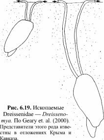 шой пресноводный сток, создававший рас- преснённую линзу на поверхности. Всё это приводило к ухудшению аэрации придонных слоёв, и, по-видимому, возникновению частных заморов. Экологическая ниша моллюсков-детритофагов при появлении подходящих условий (улучшении кислородного режима) заполнялась автохтонными дериватами, например двустворчатыми моллюсками Limnocardiinae и Dreissenidae (рис. 6.19), но через некоторое время они вымирали. Поэтому биотопы, занятые в водоёмах с океанической солёностью сообществами моллюсков-детритофагов, в Каспийской области заняты сообществами, в которые входят мол- люски-фильтраторы (эпифауны твёрдых грунтов и инфауны), а в автохтонной биоте Каспия детритофаги представлены ракообразными и полихетами Ampharetidae. Двустворчатые моллюски же сравнительно мало специализированы, т. е. обладают широким спектром питания: от детритофагии до фильтрации. Аналогичная ситуация существовала и в водоёмах предшествовавших Каспию, формировавшихся на территории Паратетиса, например, в позднесарматском и раннеакчагыльском водоёмах. Сходным образом из состава бентоса выпали бентосные хищники (гастроподы, декаподы) (Невесская, 1999).