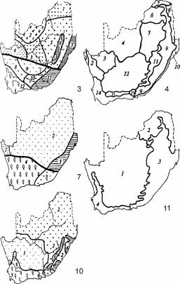 1— классы формаций в Южной Африке (Dansereau, 1957), 2 — растительные зоны Южной Африки, по И. Гофману (Lesnicky..., 1955), 3 — географические зоны Южной Африки (Страны..., 1973), 4 — растительность Южной Африки, по В.В. Алехину, J1. В. Кудряшову и В. С. Говорухину (1957), 5 — растительность Южной Африки, по B.C. Говорухину (1950), 6 — природные зоны Южной Африки, по карте «Природные зоны мира» (1976), 7 — растительность Южной Африки, по А.И. Зубкову (Страны..., 1973), 8 — растительность Южной Африки, по Т.В. Власовой (Физическая..., 1966), 9 — основные зональные типы растительности Южной Африки, по Т.В. Власовой (Физическая..., 1966), 10 — флористические районы Южной Африки, по Эвансу. По Hutchinson, 1946), 11 — по С.М. Разумовскому методом выделения ЦС. По С.М. Разумовскому (1999, 2009). Обратите внимание, что рис. 6 и 7 взяты из одной книги. Расшифровку районов приведённых схем можно найти в указанных трудах С.М. Разумовского.
