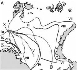 Рис. 5.13. Районирование Баренцева моря по бентосу по разным авторам. По В.Н. Семёнову (1986). А: I — границы Арктического и Атлантического бореального субрегионов (подобластей) A. Ortmaim (1896); Ila — qgt;aHH4a арктической подобласти по Г. Вроху, для планктона, Пб —для бентоса, III — граница между арктическим и субарктическим бентосом по К.М. Дерюгину, IV — граница между Арктической областью (Region) и Бореоарктическим переходным районом (Ubergangsgebiete) по Hofsten (1915), V — ^gt;аница между Арктической и переходной Атлантической областями по Е. Hentschel, VI — граница между высоко- и низкоарктической подобластями по В.А. Броцкой и J1.A. Зенкевичу (1939), совпадает с границей А.А. Шорыгина (1928), VII — граница между арктическим и бореальным бентосом по З.А. Филатовой (почти совпадает с соответствующими границами А. Шорыгина, В.А. Броцкой и J1.A. Зенкевича, 3. Щедриной), Vila — средняя граница распространения первой qgt;ynnbi бореальных элементов по З.А. Филатовой (1938), VIII — граница между высоко- и низкоарктической подобластями по донным фораминиферам, IX — ^gt;аница между Арктической и Бореальной областями (VIII и IX — по донным фораминиферам по J1.A. Дигас (1969), X — ^gt;аница между Арктической и Бореальной областями по В. Брязгину (1973).