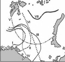 Б: I — граница максимального и II — граница минимального продвижения арктических видов на запад по А.А.
