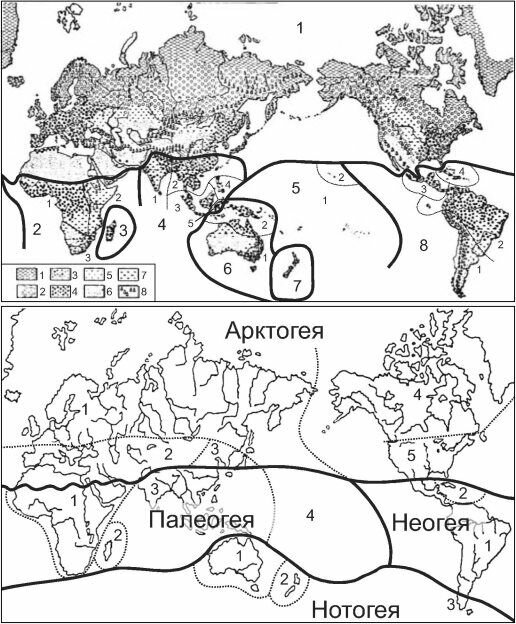 А — по Н.А. Бобринскому (1946). Области (и подобласти): Голарктическая, Эфиопская (1 — Западноафриканская, 2 — Восточноафриканская, 3 — Южноафриканская), Мадагаскарская, Индо-Малайская (1 — Индийская, 2 — Бирманско-Китайская, 3 — Зондская, 4 — Филлипинская, 5 — Целебесская), Полинезийская (1 — Полинезийская, 2 — Гавайская), Австралийская (1 — Австралийская, 2 — Папуасская), Новозеландская, Неотропичес- кая (1 — Патагонско-Чилийская, 2 — Бразильская, 3 — Центральноамериканская, 4 — Антильская). Ландшафты: 1— тундра, 2 — тайга, леса (широколиственные и субтропические), 3 — влаголюбивый тропический лес, 4 — степь, 5 — пустыня, 6 — саванна, 7 — горы.