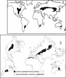 Лукичева (1953) выделяют на территории Западной Сибири «западный меридиональный сектор», характеризующийся преобладанием сосняков. Авторы объясняют это климатом (близость Уральского хребта снижает количество осадков) и преобладанием песчаных почв. В действительности в этом районе песчаные ледниковые (в данном случае — единственно возможная материнская порода) отложения практически отсутствуют, а резкое преобладание сосняков, действительно почти сплошь покрывающих водоразделы, связано с постоянным выжиганием лесов местными оленеводами (для увеличения площади ягельников) (Разумовский, 2008). Очевидно, что естественный с точки зрения географов выдел, с точки зрения биолога представляет собой лишь временную стадию развития тайги и вовсе не заслуживает какого-либо выделения на биогеографической карте (но вполне может быть показана на карте хозяйственной деятельности человека, наряду с полями и сенокосами).В биологической литературе из-за неразработанности биологических методов классификации и выделения ЦС и сообществ имеется тенденция использовать географические подходы. Выше обсуждалась принципиальная неприемлемость такого подхода для целей биологии. Но такой подход неприемлем и по другим причинам. Желание биологов использовать географические методы и их результаты основано на ошибочном представлении о том, что в географии всё давно разработано, устоялось и можно взять готовую схему и использовать её в биологических целях. К сожалению, это не так. Критерии выделения регионов и в географии весьма субъективны. Это следует хотя бы из того, что один и тот же биом разные авторы понимают весьма различно, хотя и называют одинаково. В качестве примера на рис. 5.28 дано распространение биома степей по разным авторам. Из сравнения этих схем становится очевидной высокая степень их субъективности, неоднозначности применения этого подхода в самой географии.