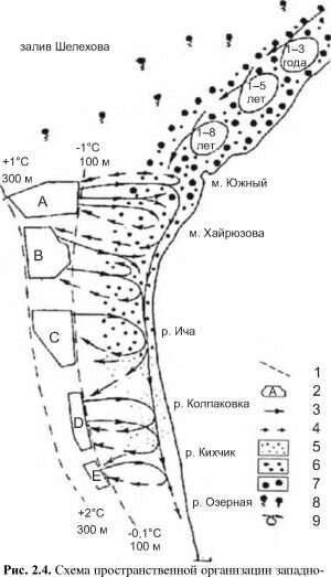 1 — изобаты и придонные температуры на зимовке краба; 2 — зимовки разных субпопуляций (обозначены буквами); 3 — весенние нерестовые миграции; 4 — осенние миграции на зимовку; 5 — зона, где пелагические личинки встречаются редко; 6 — концентрации зоэа I и II; 7 — дрейф и концентрация зоэа III и IV; 8 — зона выселения личинок; 9 — миграция молоди в возрасте 1-8 лет. По Родину (1985).