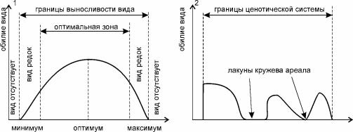1 — с точки зрения континуалистов; 2 — ценофильного вида с точки зрения структуралистов (для простоты рассмотрен вид, эндемичный для одной ЦС).