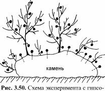 Методика таких натурных экспериментов не имеет аналогов в мировой практике и универсальна во всех случаях, когда нужно измерить локальное движение воды — в зарослях водорослей или вокруг единичного растения, на каких-либо конструкциях и т.д. Чтобы учесть интенсивность движения воды вокруг конкретных точек слоевища или субстрата, используют гипсовые шарики определённой массы (10-50 мг). Гипсовую смесь наносят на тонкие проволочки или синтетические нити, в два-три приёма наращивая шарики нужного размера (рис.3.50). На слоевище бурой Desmarestia (длиной до 60 см) удавалось разместить до 100 шариков, на слоевище красного Ceramium — 8-10 штук. Естественно, все шарики должны быть помечены — цветом или номерами. Скорость растворения гипса при определённых скоростях движения воды известна, поэтому по начальной (до эксперимента) и конечной (после эксперимента) массе шариков можно судить об интегральной подвижности воды во время экспозиции. Для той же цели используют и модели талломов, покрытые гипсовым слоем (Хайлов и др., 1988). Эта методика позволила выяснить, что вода гораздо активнее движется у разветвлений и неровностей талломов, а также у выступов и перегибов субстрата, образуя турбулентные потоки и обеспечивая постоянный подток питательных веществ. Именно поэтому на неровностях субстрата растительность всегда более богатая и мощная, чем на ровном дне, а разветвлённые талломы имеют более интенсивный обмен со средой и, соответственно, более продуктивны.