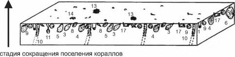 Рис. 3.53. Изменение состава сообществ при развитии поселений ветвистых кораллов на мелководье у атлантических берегов юга Северной Америки в плиоценовое время. По Bailey, Tedesco (1986) из JI.A. Невесской (1999: 330).