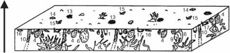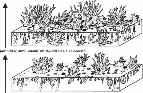 Строение рифа определяет, в первую очередь, дифференциальный рост кораллов (рис. 3.61). Разрушение рифа в результате действия биотических (непосредственное выедание кораллов, разрушение скелета сверлильщиками) и абиотических (волновое