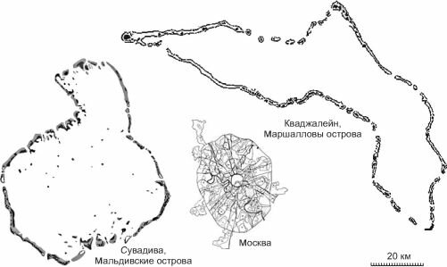 Самые крупные атоллы — Сувадива (Мальдивские о-ва, Индийский океан) и Ква- джалейн, или Меньшикова (Маршалловы о-ва, Тихий океан). Лагуна атолла Меньшикова имеет 120 км в длину и до 30 км в ширину (рис. 3.62).
