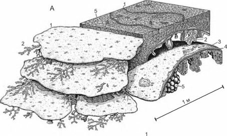 ныне вымершие таксоны (рис. 3.65). Первые кишечнополостные с известковым скелетом (Tabulata) появились в ордовике. Затем появляется вторая группа кишечнополостных с известковым скелетом — ругозы. С появлением ругоз рифовые постройки достигли современных размеров: площадь — сотен квадратных километров, толщина — 1,5 км.