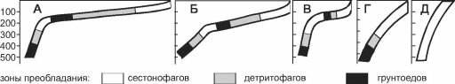 А, Б — широкие шельфы с выраженной зоной осадконакопления в центральной части; В — узкий шельф со слабо выраженной зоной осадконакопления; Г, Д — увеличение крутизны шельфа приводит к сдвигу за пределы шельфа или к исчезновению зоны детритофагов. По А.А. Нейман (1988)