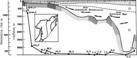 1,2 — фильтраторы эпифауны (1 — мелководные, 2 — глубоководные); 3 — фильтраторы инфауны; 4 — собирающие детритофаги; 5 — грунтоеды; 6 — потоки глубинных океанских вод. Римские цифры — разные водные массы: I — поверхностная, II — подповерхностная, III — главный термоклин, IV — глубинная. Кривая — средняя биомасса. По А.П. Кузнецову (1982).