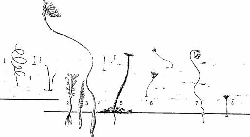 1 — Radicipes verrillii; 2 — Chondrocladia gigantea; 3 — Povanaria; 4 — Umbelula; 5 — полихета Potarnilla syrn- biotica; 6 — Cryptospongia enigrnatica; 1 — асцидия Culeolus; 8 — Kinetoskias. По А.И. Савилову (1961).